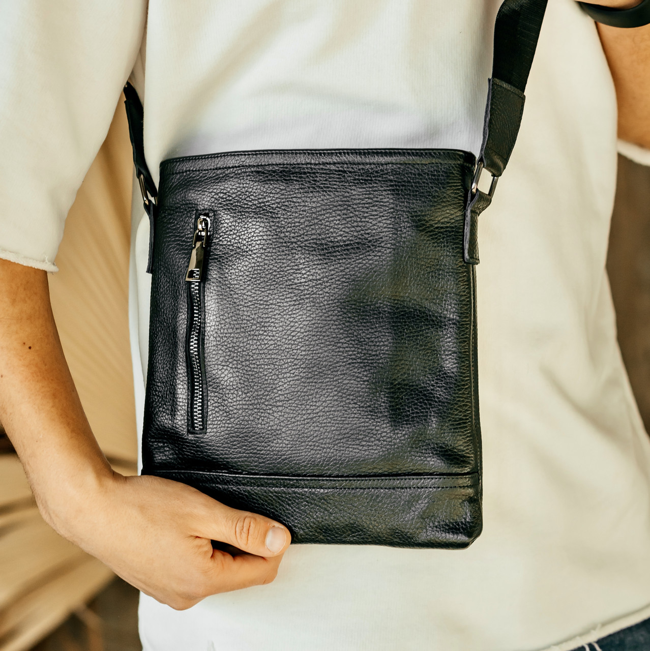 Чоловіча містка шкіряна чорна сумка-планшет через плече Флеш Райт, стильні сумки для чоловіків із натуральної шкіри та регульованим плечовим ременем